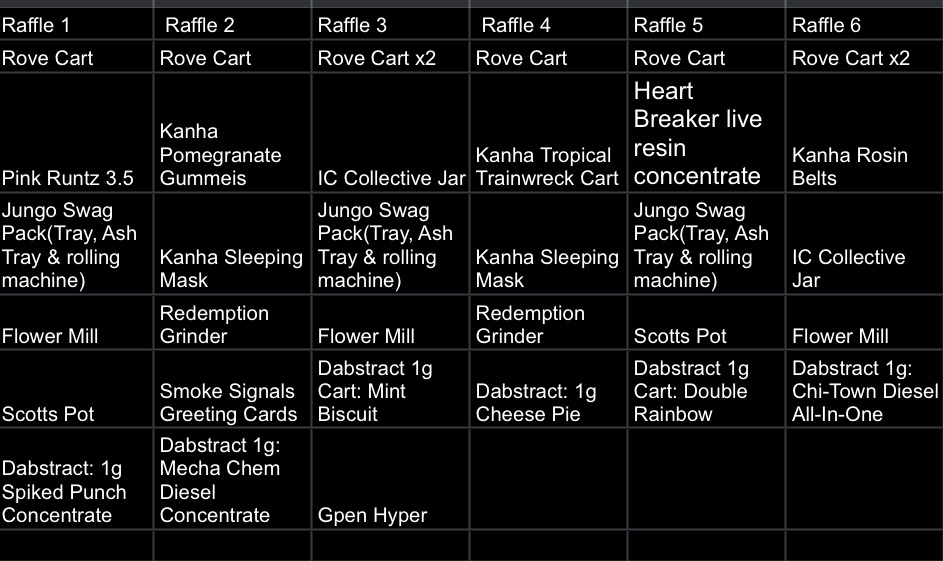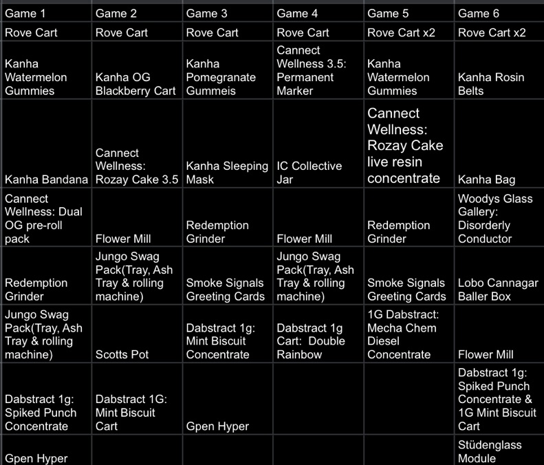 Stash Dispensary, Kanha, Northern Heights, IC Collective, Redemption Botanicals, Cannect Wellness, Rove (who not only brought the heat with prizes, but also came through with pizza for the crowd!) and Lobo with their baller box with 6 Lobo cannagars for our game six winner to enjoy!