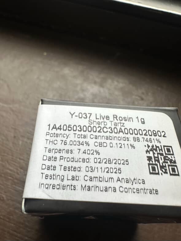 Effects wise, Sherb Tartz gave off a fairly a balanced high. It’s perfect for relaxation without leaving you feeling couch locked, making it great for unwinding after a long day or even a midday dab to take the edge off a stress day. It also gave off a nice euphoric and calming buzz, making it an excellent choice for both social and solo use.