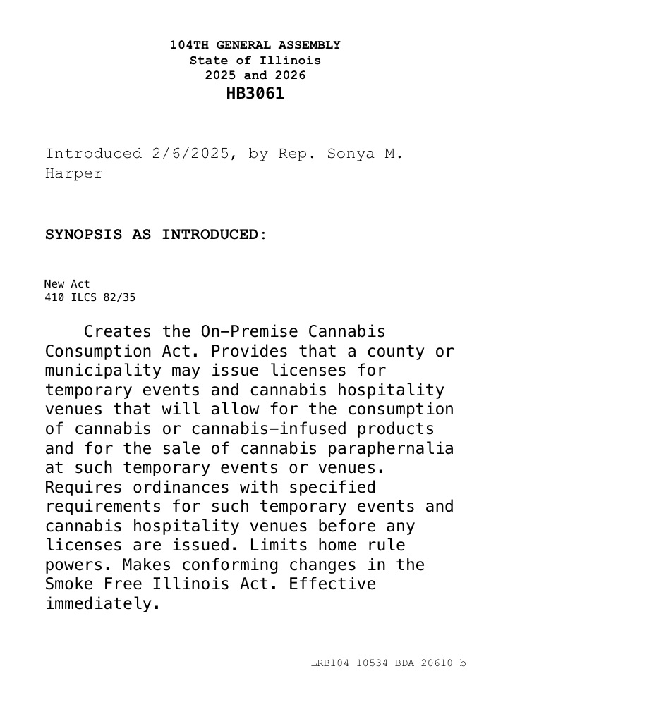 Instead of building this whole new system with HB3061/HB3513, which seems likely to create these financial roadblocks, couldn’t Illinois use something we already have? The Smoke Free Illinois Act is already in place and regulates where smoking is allowed. It seems like a more straightforward path could be to amend the Smoke Free Illinois Act to include specific provisions for licensed cannabis consumption areas.