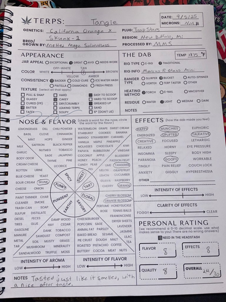 What’s up, everybody? Today, I am back cracking into my second jar of Melted Magic Solventless, which I picked up from Trap Stars in New Buffalo, Michigan. This time, I’ll be diving into a 5-gram jar of their Tangie live rosin, a cross of California Orange×Skunk−1. If you didn’t see my review of their Sherb Cream Pie Live Rosin, make sure to check that one out too!