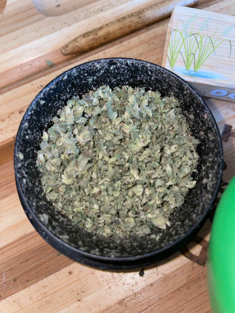 Upon opening the jar, I was greeted by four beautiful nugs absolutely covered in trichomes. Their light green color was accented by deep purple hues bursting through the frosty coating of trichomes, with bright orange hairs hugging each nug tightly. The flower had a dense structure, and when broken down, it revealed a fluffy, sticky texture, perfect for rolling.