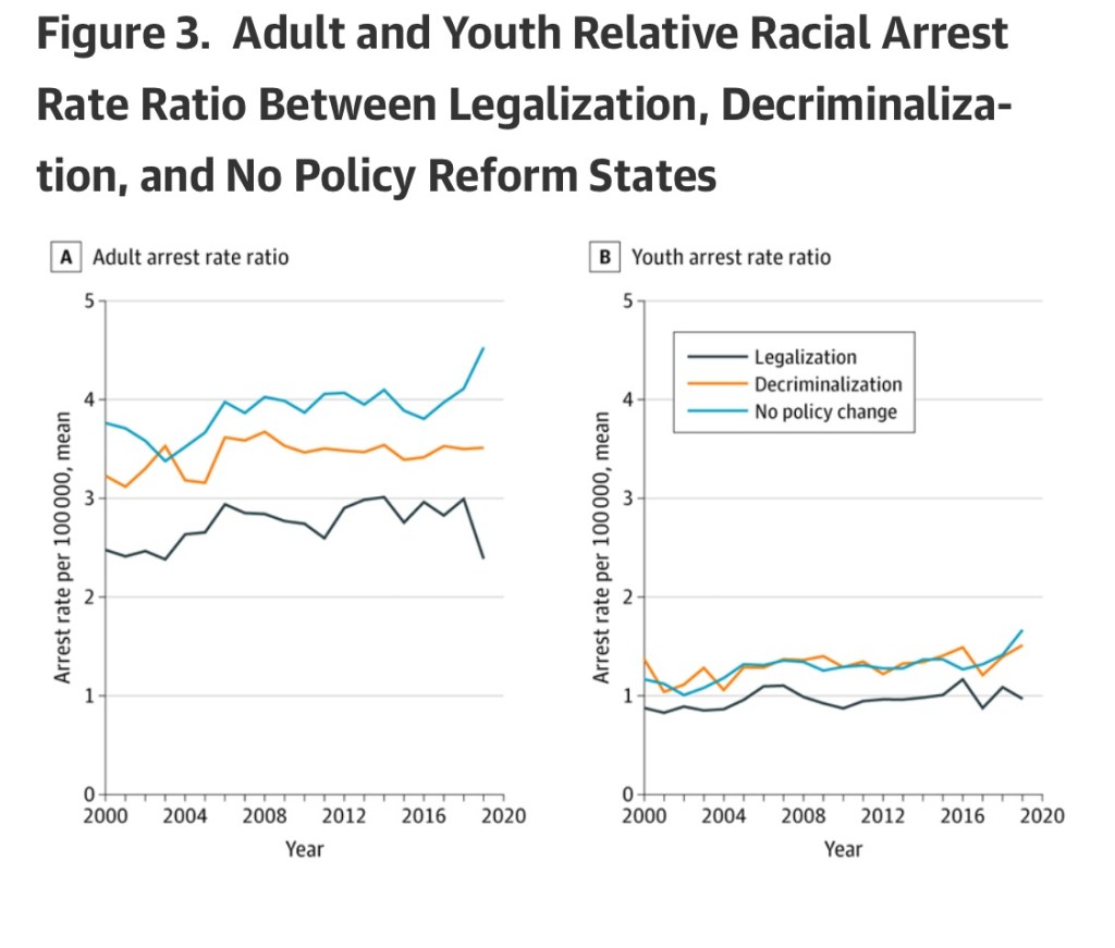 Another study covering 37 states (2000–2019) found that while decriminalization was associated with a modest 17% decrease in the Black-to-White arrest ratio among adults, there was no reduction among youth, showing how systemic bias continues to shape enforcement practices even as laws change. (PubMed, 2022)