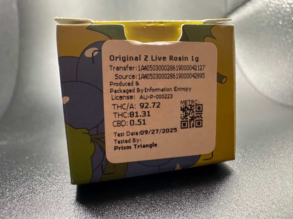 I made a recent stop at one of the more highly suggested dispensaries in Michigan while I was in the New Buffalo area, Information Entropy, and had a wonderful experience (see my article about my whole visit). While there, I tried to grab a little bit of what they had to offer from their house brand along with a couple other favorites from other companies that they carried. I’ve heard that Information Entropy’s hash rosin was top tier so I decided to grab the Original Z, which is one of my favorite strains, especially as rosin.