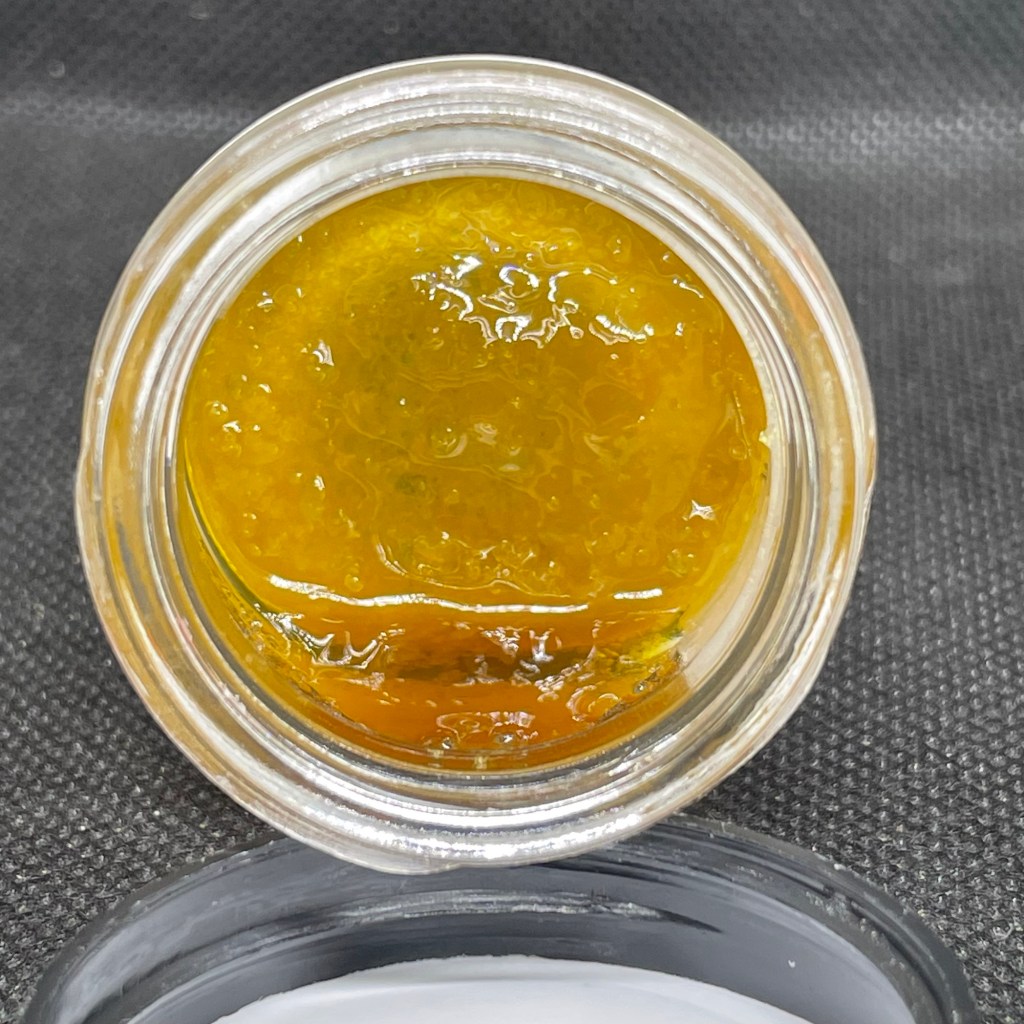 This jar was consistent with the rest of their live sugar sauces. It has a glossy layer of terpenes on top and beautiful sugar crystals underneath waiting for you to scoop into your banger or erig. I like to mix my sugar sauces to make them easier to scoop out instead of fighting with a flat dabber. I have been dabbing this at 480 degrees which gave me that same sweet candy berry flavor with a slight gas note on the exhale. It left no dark residue in my banger, only a clean light golden puddle.