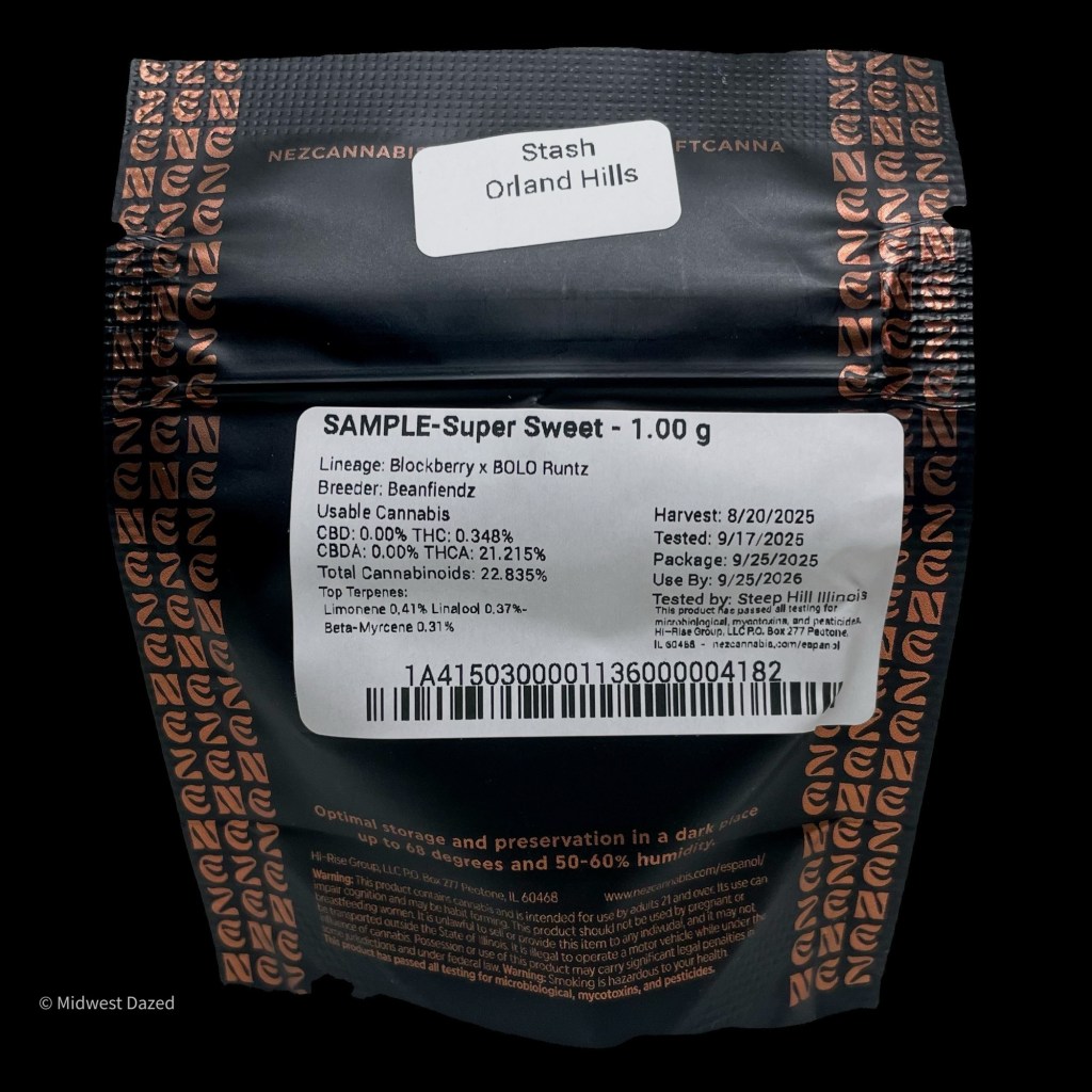 Recently I received a sample of Super Sweet by Nez, an Illinois craft grower known for a wide portfolio of cultivars from Mac Stomper to their award winning indica Cadillac Rainbows which took home Best in Grass back in 2024. Super Sweet immediately caught my attention because it is a cross of Blockberry x BOLO Runtz, two popular strains we see often in the market, and the nose lives up to the name. Below we take a look at the label details and break down the bud, smoke, and effects.